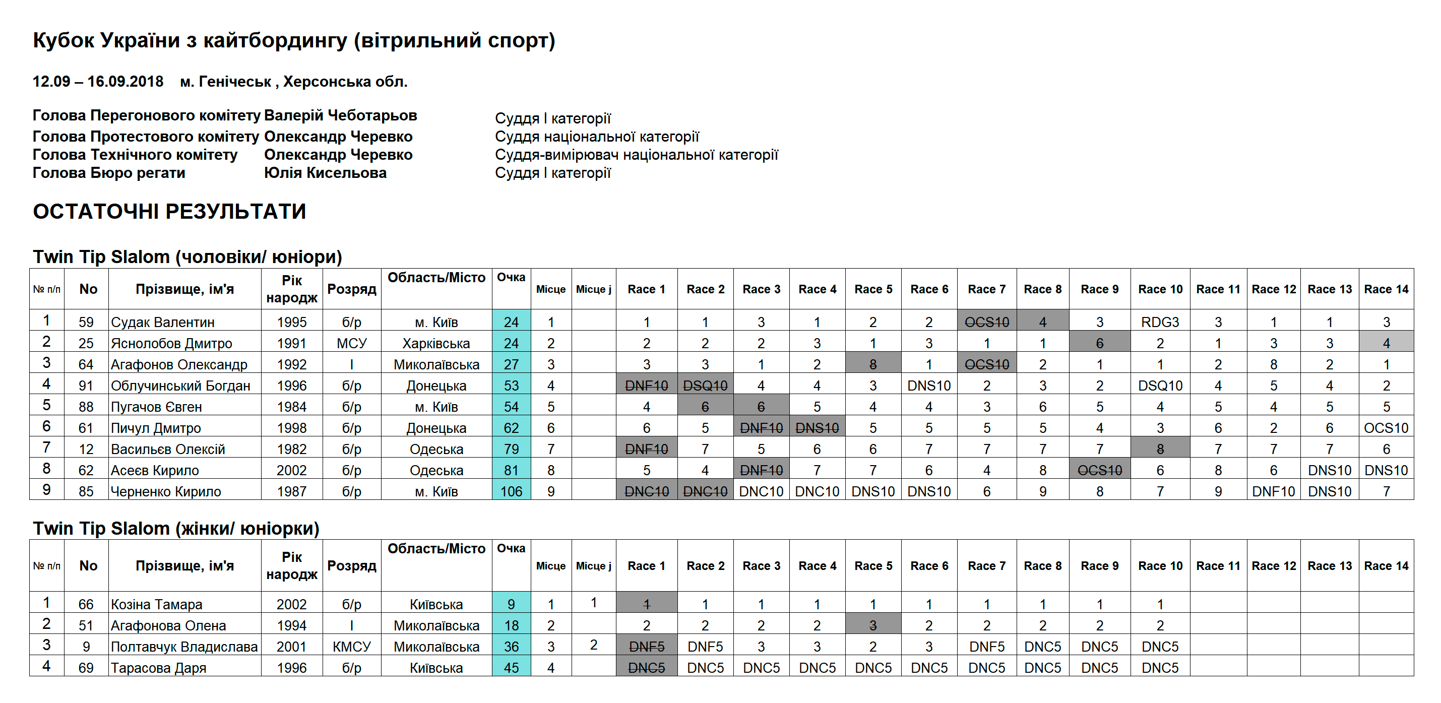 Результаты Кубка Украины по кайтбордингу 2018 (Twin Tip Slalom)